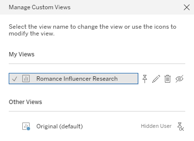 Once set filters can be saved in individual views. This allows you to define various applications for yourself which you can easily access with one click. You can jump between views, e.g., "Find German TikTok bookfluencers in Romance" and "Find American Youtube bookfluencers in Young Adult"