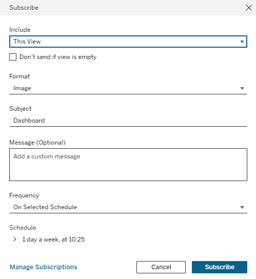 You can define e-mail subscriptions for any view you saved. The e-mail contains a PDF or screenshot of the dashboard with your selected view. You can choose how often you want to receive those subscription e-mails and manage them at any time. This helps you to get a quick overview "has anything changed"? And if so, jump into the tool to dive deeper.